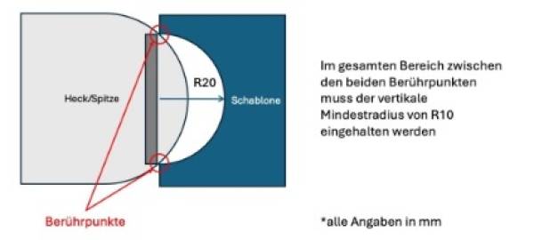 1.4.1.1.4 Alle Boote müssen an Bug- und Heckspitze einen Mindestradius von 2 cm waagerecht und 1 cm senkrecht aufweisen. Die Kontrolle erfolgt gemäß dem folgenden Bild:
